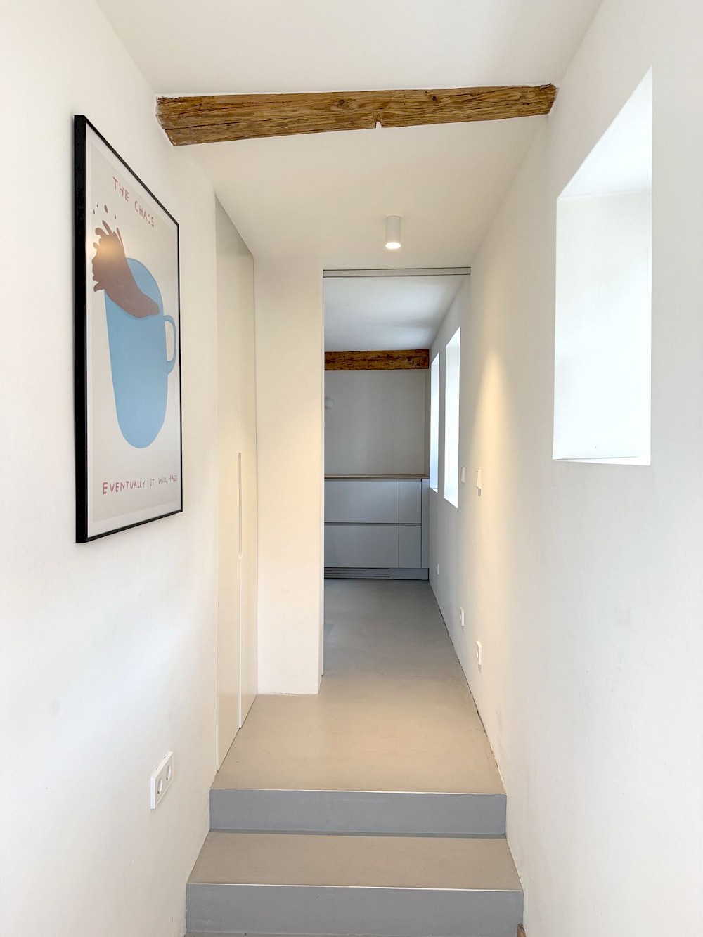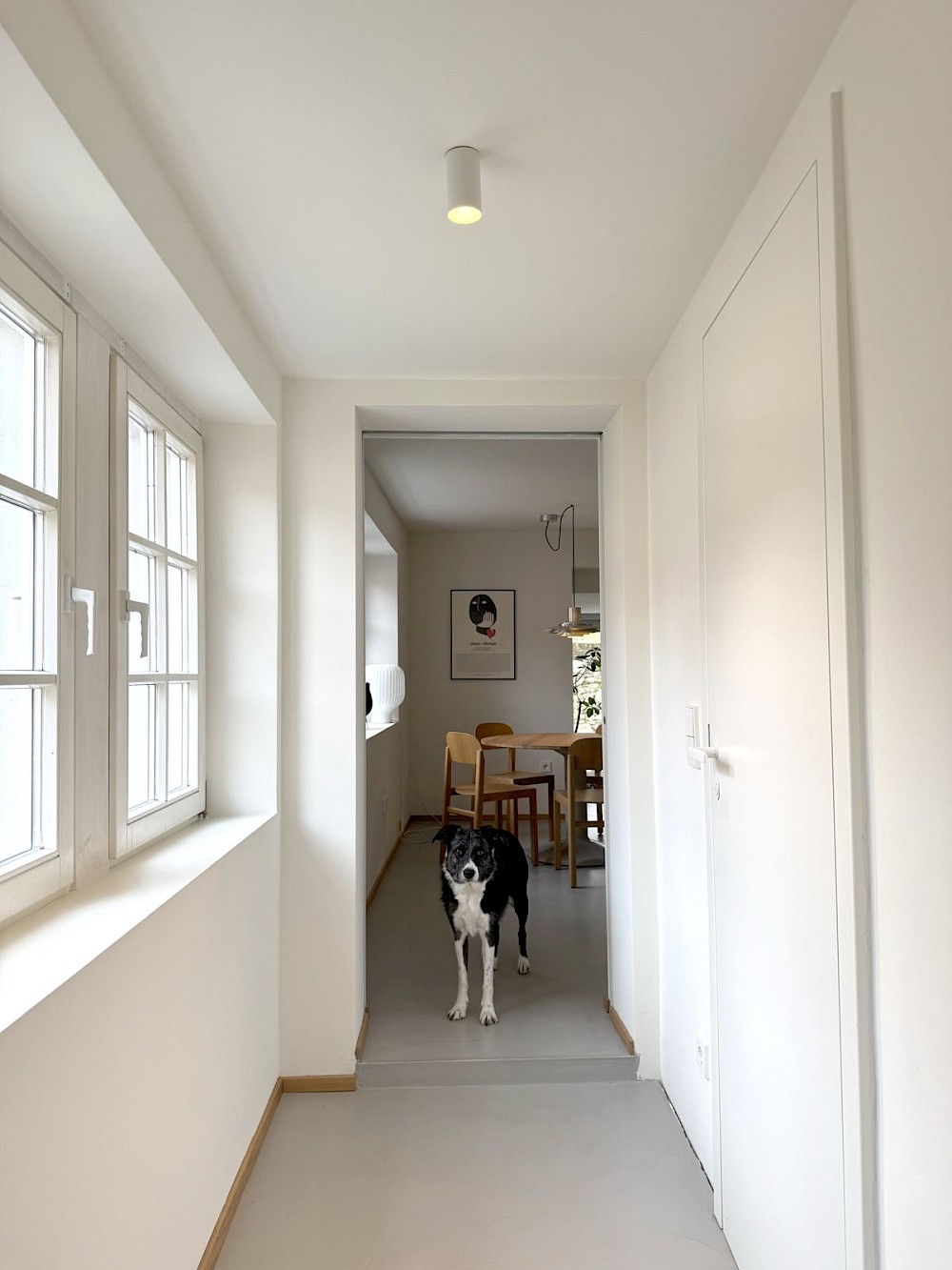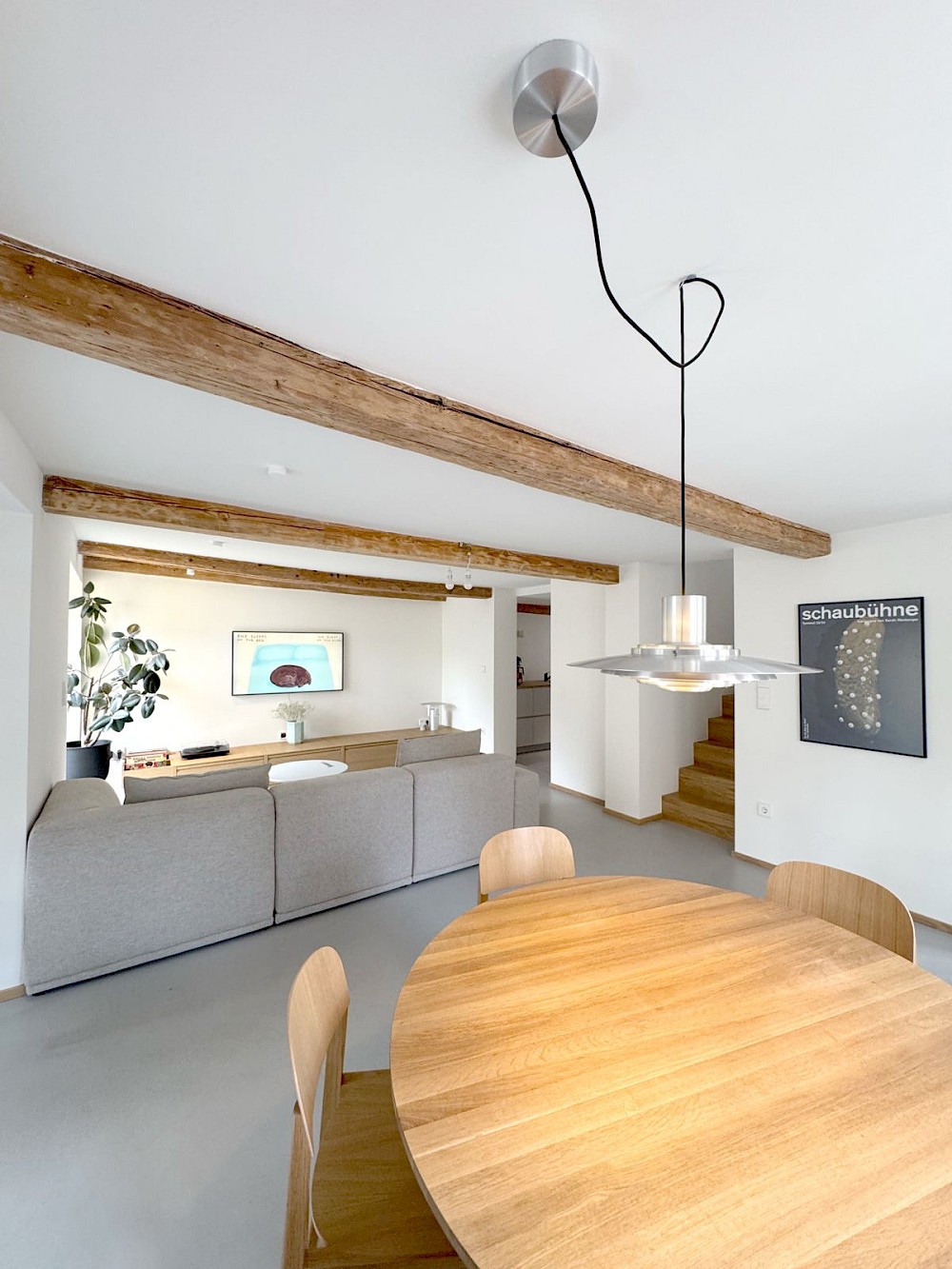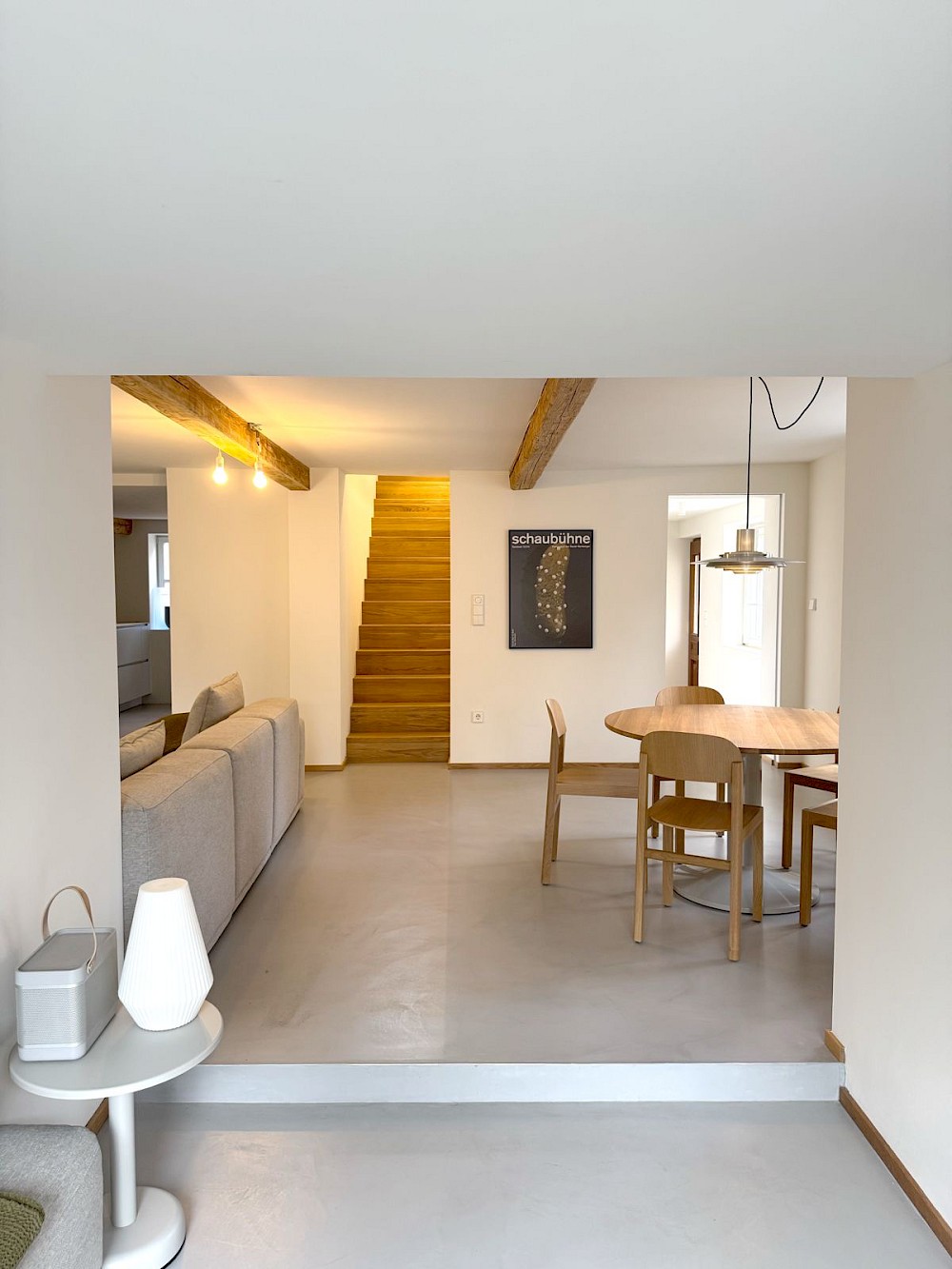 Auf rund 100 Quadratmetern Wohnfläche entstand ein Haus für ein Paar, das im Design arbeitet, und für einen Hund, der das Haus mitbewohnt. Die Räume sind ruhig, hell und zurückhaltend. Sichtbare Holzbalken bleiben Teil der Geschichte, glatte Flächen und präzise Einbauten geben ihr eine neue Ordnung. Der Innenraum ist offen gedacht, ohne seine Maßstäblichkeit zu verlieren. Übergänge sind fließend, Nutzungen nicht überformt.