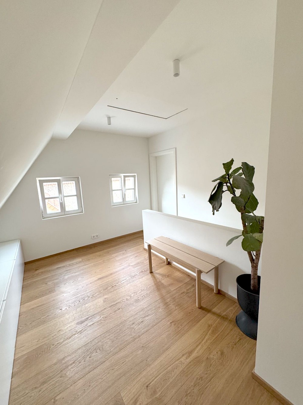 Im Obergeschoss lag die Stehhöhe über weite Strecken unter zwei Metern. Der Dachraum war vorhanden, aber nicht nutzbar. Durch die Neuordnung der Kehlbalkenebene wurde der Dachstuhl geöffnet und ein zusammenhängender Raum geschaffen, der Licht, Höhe und Proportion neu ausbalanciert. Die ehemalige Leitertreppe wich einer klar geführten, gut begehbaren Treppe, die die Ebenen selbstverständlich miteinander verbindet und den Alltag neu organisiert.