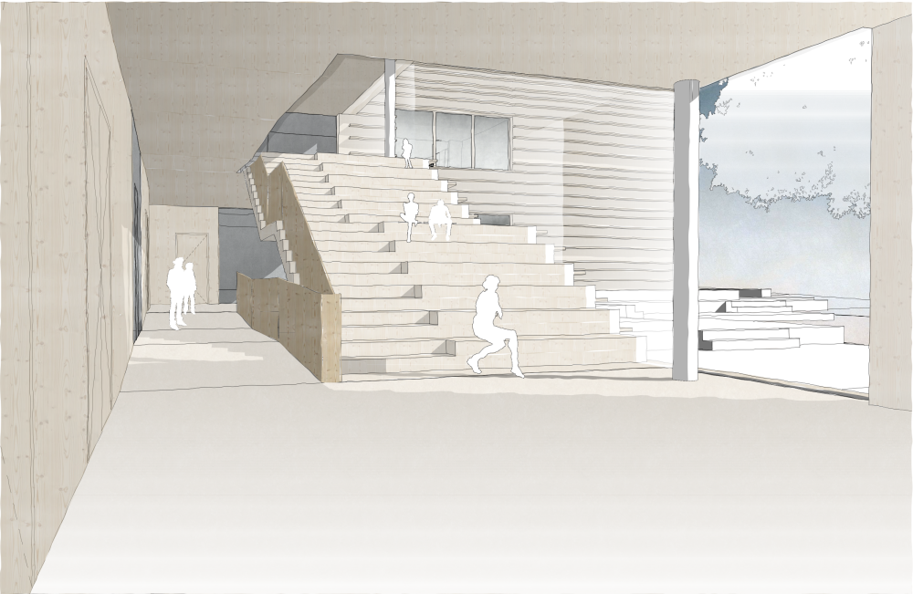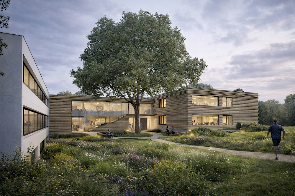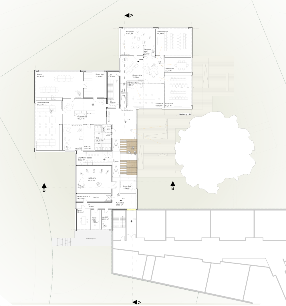Im Inneren bildet eine zentrale, geschossverbindende Achse das räumliche und soziale Herz des Hauses. Sie ist mehr als Erschließung, sie wird Aufenthaltsraum, Kommunikationsort und gemeinschaftliche Mitte. Flexible Raumfolgen, klare Zonierungen und großzügige Blickbeziehungen ermöglichen vielfältige pädagogische Nutzungen zwischen Konzentration, Austausch und Rückzug. Der kontinuierliche Bezug zum Außenraum und der Erhalt der prägenden Hofeiche verankern das Gebäude im Naturraum und machen diesen im Alltag erlebbar.