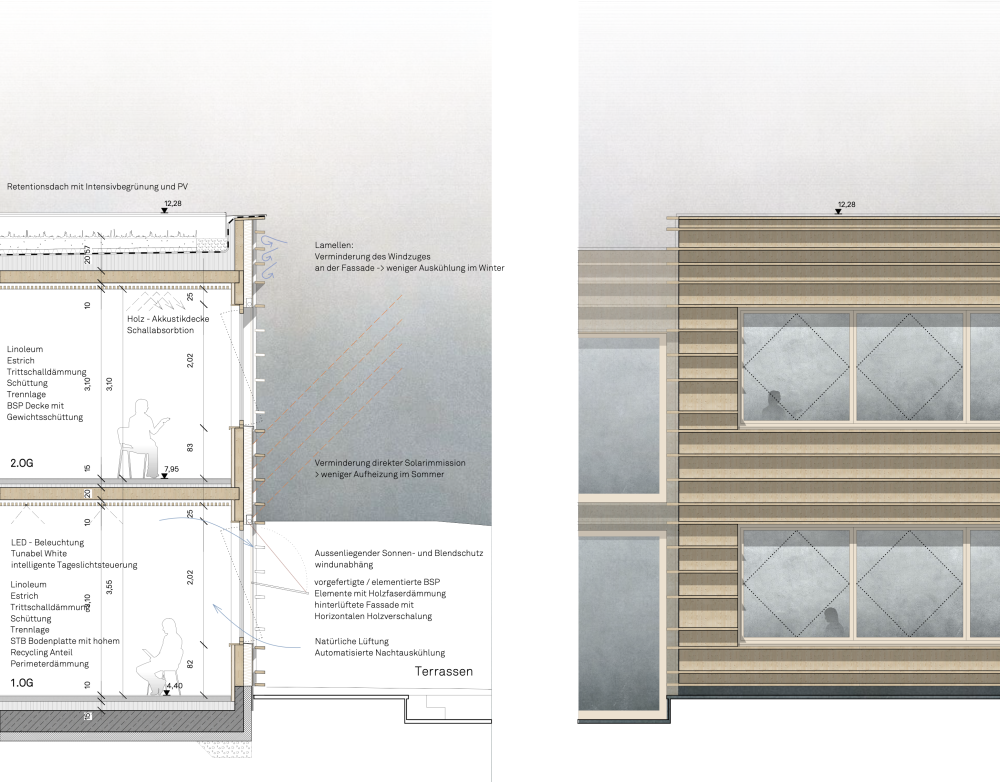 Die Konstruktion folgt einer konsequenten Holzbauweise mit hohem Vorfertigungsgrad und einem überwiegenden Anteil nachwachsender Materialien. Sie erlaubt Anpassungsfähigkeit, Ressourceneffizienz und eine kurze, emissionsarme Bauzeit. Ergänzt wird dies durch ein robustes Low Tech Konzept mit natürlicher Lüftung, wirksamem sommerlichem Wärmeschutz, begrüntem Retentionsdach und einer weitgehend energieautarken Versorgung über Photovoltaik.
